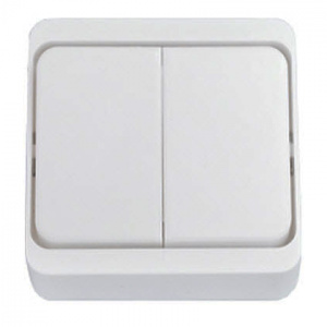 Выключатель двухклавишный открытой установки. В качестве материала для производства изделия использовался специальный очень прочный и экологически безопасный полимер. Изделие надёжно защищено от разрушительного воздействия ультрафиолетового излучения, не претерпевает видимых изменений при постоянных многочисленных эксплуатационных контактах.
